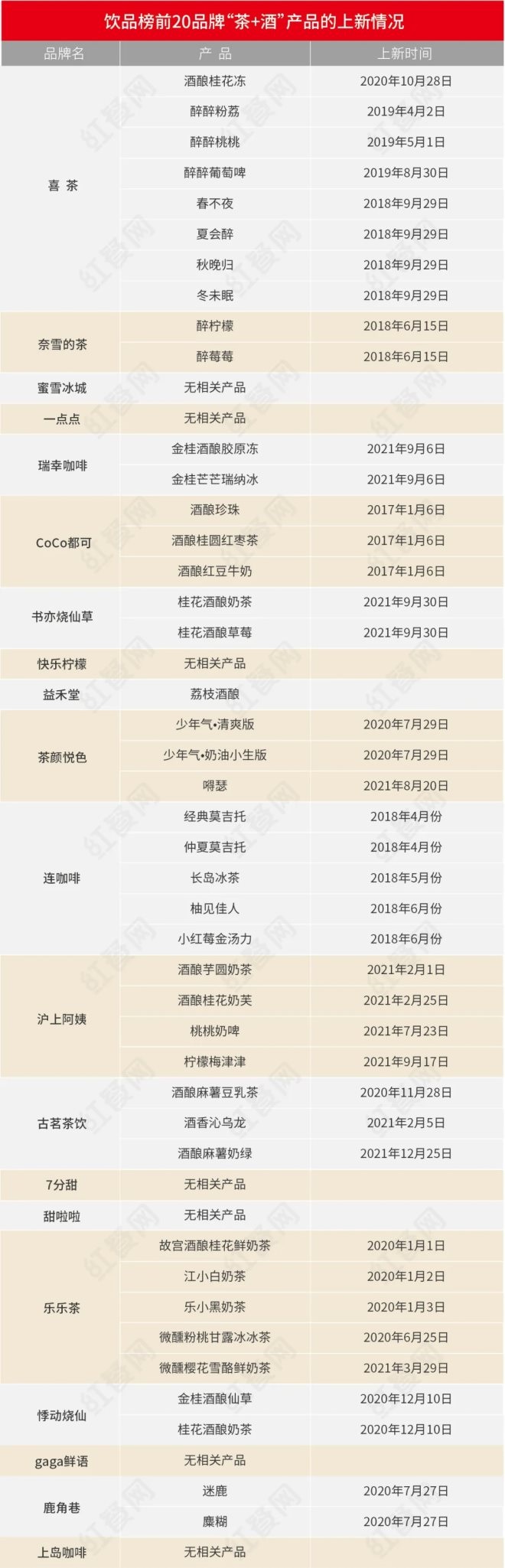 而紅餐網(wǎng)進(jìn)一步整理發(fā)現(xiàn),飲品榜前20的品牌(按7月1日的紅餐榜指數(shù)分值排序),有13個(gè)曾推出過“茶+酒”的產(chǎn)品,包括喜茶、奈雪的茶、瑞幸咖啡、CoCo都可等,相關(guān)產(chǎn)品共計(jì)42款。