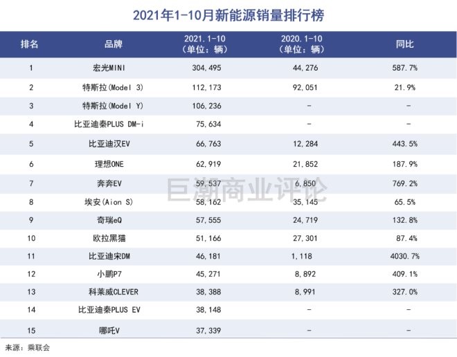 可以看到,今年1-10月,宏光MINI、比亞迪漢EV、理想ONE、小鵬P7等車型相比去年同期增長都超過一倍,同時都位列今年新能源車銷量排行榜前列。