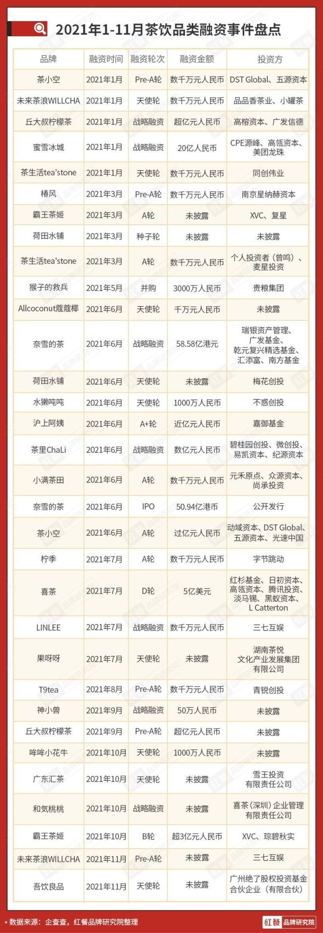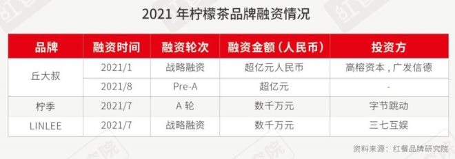 今年細分茶飲賽道中最大的贏家非檸檬茶莫屬。最直觀的表現(xiàn)就是“融資、斷貨”成該品類關鍵詞。紅餐品牌研究院統(tǒng)計發(fā)現(xiàn),2021年檸檬茶賽道涌現(xiàn)出4筆融資事件,具體如下圖。