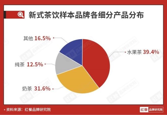 紅餐品牌研究院數(shù)據(jù)表明,在抽樣的1000家新式茶飲品牌的產(chǎn)品中,水果茶產(chǎn)品的占比非常高,達到了39.4%,明顯高于奶茶31.6%的比例?梢,水果茶依然是茶飲門店中的中流砥柱,是提升門店銷售額的重要因素。