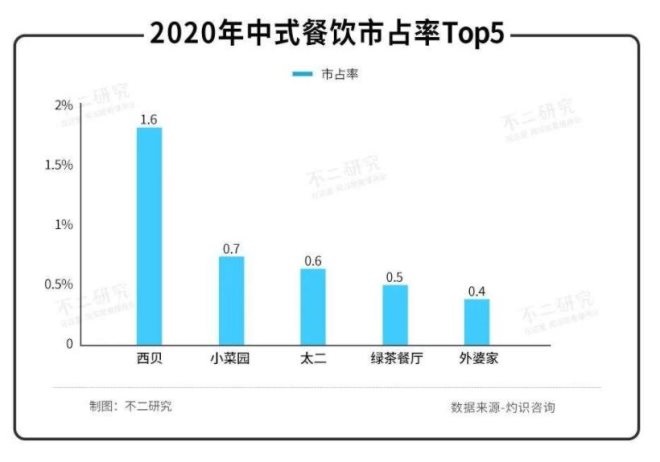 中式餐飲賽道競爭分散且激烈。據(jù)灼識咨詢報告,2020年中式餐飲市占率Top5分別為:西貝市占率1.6%;徽菜品牌小菜園市占率0.7%;太二市占率0.6%;綠茶餐廳市占率0.5%;外婆家市占率0.4%。