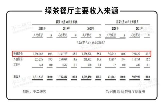 餐廳經(jīng)營是綠茶餐廳收入的主要來源。招股書顯示,2018~2021年前5個月,綠茶餐廳來源于餐廳經(jīng)營的收入分別為80.5%、85.3%、85.1%和87.7%,占比均超八成。