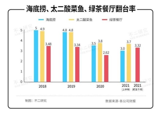 在平價基礎(chǔ)上,高翻臺率成為盈利的核心要素,但綠茶餐廳的翻臺率似乎并不盡人意。招股書顯示,2018~2021年前5個月,綠茶餐廳翻臺率分別為3.48、3.34、2.62和3.32,雖在2018~2020年逐年下降,但2021年前5個月已基本回升至疫情前水平。