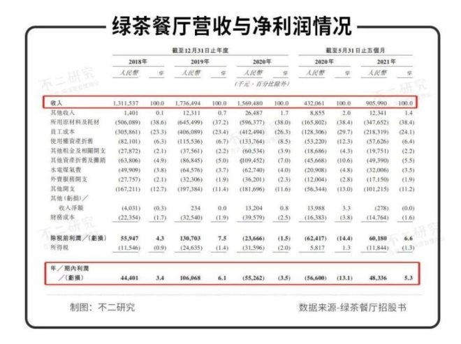 招股書數(shù)據(jù)顯示,2018~2021年前5個月,綠茶餐廳的營收分別為13.12億、17.36億、15.69億及9.06億元其中,2021年前5個月,營收增速同比高達109.69%,呈現(xiàn)高速復(fù)蘇態(tài)勢。
