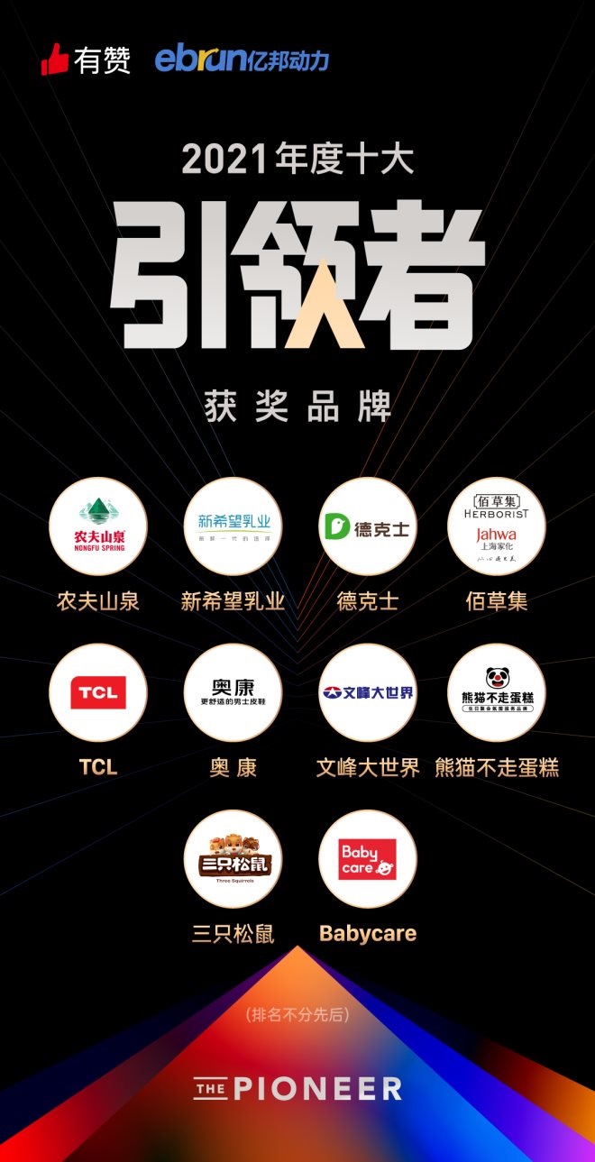 11月27日在有贊9周年生態(tài)大會上,由有贊和億邦動力聯(lián)合主辦的“2021年十大引領(lǐng)者”評選結(jié)果正式揭曉,10家企業(yè)入選。