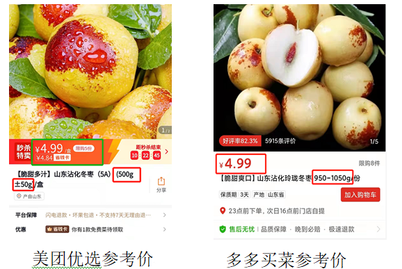 打開應(yīng)用,標(biāo)紅標(biāo)粗的價格直接映入消費者眼簾,所謂的低價策略也可能是商家在“玩花樣”,以山東沾化大棗為例,在美團優(yōu)選和多多買菜上定價相同,均為4.99元/份,消費者通常會默認(rèn)兩者同價、同量,殊不知商品重量同樣是需要關(guān)注的重點。