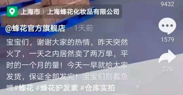 聞訊而來的消費(fèi)者,因為心疼蜂花再度上演了野性消費(fèi)的戲碼,沖進(jìn)蜂花直播間一天買了2萬單,差不多等于蜂花平常一個月的銷量。