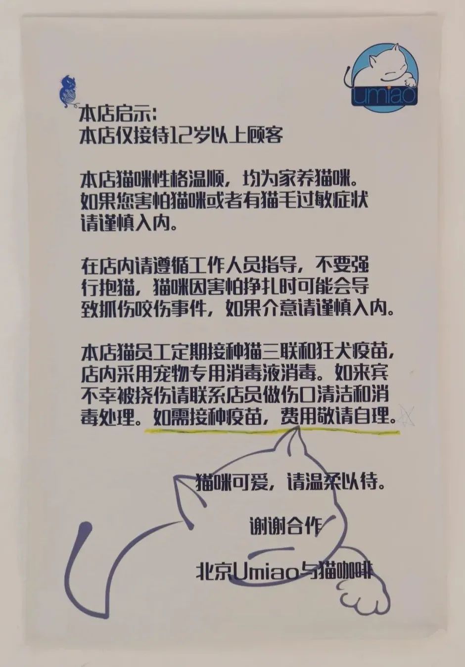Umiao不接待12歲以下的顧客,因為從豐容的角度看,兒童對貓咪的傷害很大,安全隱患不容忽視。Umiao也不售賣貓條,不接受過度投喂。店里的三十七、八只貓咪不會同時上班,它們輪流休息。