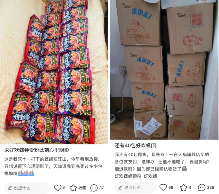 剛過(guò)去不久的雙11,不少螺螄粉愛(ài)好者們都進(jìn)行了“補(bǔ)貨”,如今“好歡螺”被曝吃出蟲(chóng)卵,比指責(zé)品牌商家更麻煩的是,如何處理囤貨。有博主稱,家里還有40包好歡螺,但已經(jīng)確認(rèn)收貨,不知道是否能退款。