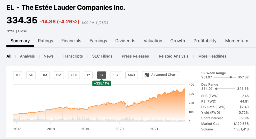 雅詩(shī)蘭黛和寶潔近5年的股價(jià)走勢(shì) 圖源:Seeking Alpha