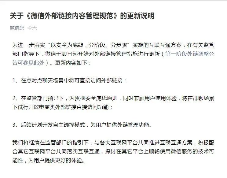 昨晚(11月29日),微信官方發(fā)布關(guān)于《微信外部鏈接內(nèi)容管理規(guī)范》的更新說明。相比第一階段,著實(shí)往前邁了一大步。300多字的說明翻譯過來就是:從11月30日起,用戶可以在微信私聊和群聊中可直接訪問外鏈,電商平臺的商品鏈接也可以打開,完成下單、支付的閉環(huán)。