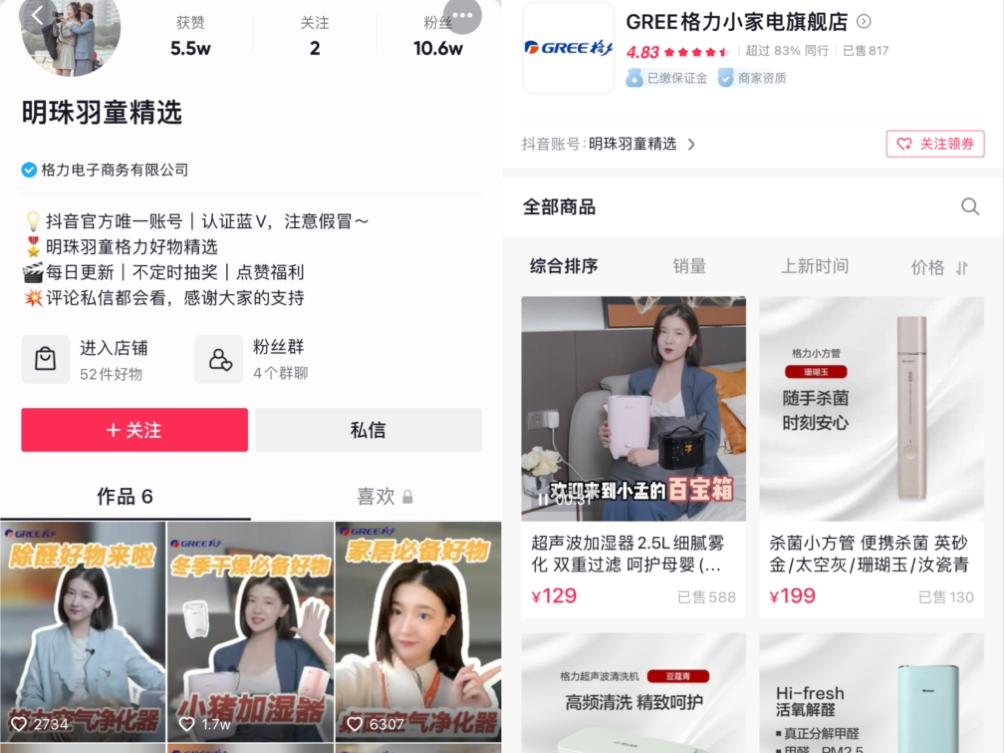 抖音賬號“明珠羽童精選”的注冊,證實了李國慶的猜測。這個賬號的頭像是董明珠與孟羽童的合照,賬號認(rèn)證為“格力電子商務(wù)有限公司”,綁定的店鋪為“GREE格力小家電旗艦店”。