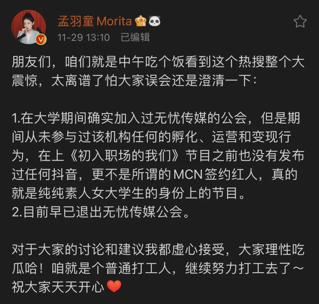 孟羽童很快在微博上作出了回應(yīng):“從未參與過該機構(gòu)任何的孵化、運營和變現(xiàn)行為,更不是所謂的MCN簽約紅人,真的就是純純素人女大學(xué)生的身份上的節(jié)目!