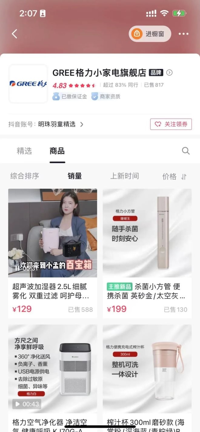 在孟羽童被推到臺前之后,吃盡流量紅利,“明珠羽童精選”賬號6天漲粉10萬,但目前的銷量卻十分慘淡。在該賬號的視頻中,孟羽童介紹的產(chǎn)品都會附上“GREE格力小家電旗艦店”的鏈接,該店鋪目前已上線了52款產(chǎn)品,均以格力小家電為主。