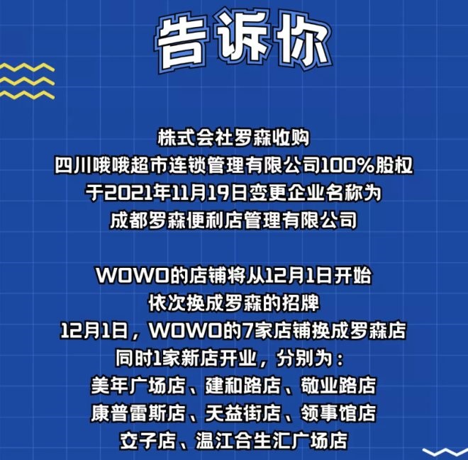 12月1日,據(jù)四川哦哦超市連鎖管理有限公司官方微信公眾號“WOWO成都”透露,株式會社羅森收購四川哦哦超市連鎖管理有限公司100%股權(quán)于2021年11月19日變更企業(yè)名稱為成都羅森便利店管理有限公司。