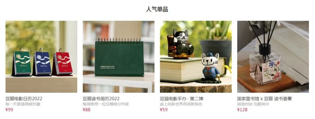 打開豆瓣,在“豆瓣豆品”頁面里,涵蓋了各類自營產(chǎn)品:電影日歷、手賬本、中性筆、豆瓣×飛躍帆布鞋、國家圖書館×豆瓣讀書香薰,等等。