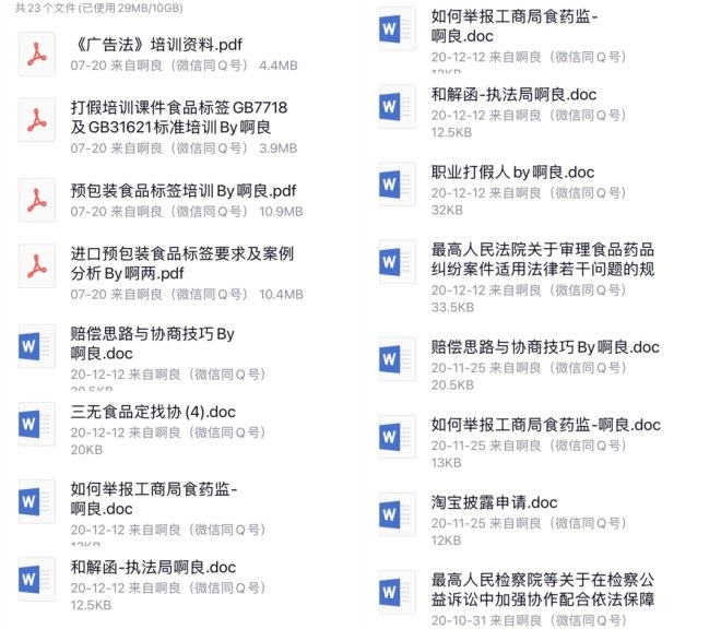以“神秘人”的群為例,有人負責搜集法律知識,整理打假技巧與話術。然后發(fā)到群文件供大家學習,從《打假小白必看》、《賠償思路與協(xié)商技巧》,到《廣告法培訓資料》、《消費者權益保護法》,《食品安全法》等,幾十個文件,足以讓一個小白“成功入門”。