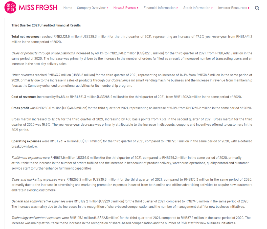財(cái)報(bào)顯示,每日優(yōu)鮮2021 年Q3的運(yùn)營(yíng)虧損為9.707 億元(約合1.507 億美元),而 2020 年同期虧損4.890 億元。