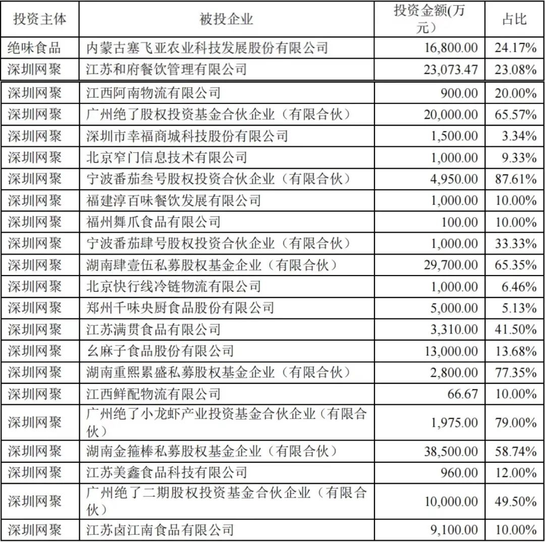 此后,網(wǎng)聚及旗下絕了基金又接連投資了幸福西餅、蛙來噠、犟骨頭、很久以前、霸蠻等餐飲品牌,以及幺麻子等后端產(chǎn)業(yè)鏈企業(yè),甚至還包括窄門等數(shù)據(jù)平臺。而直接以絕味食品投資的預(yù)制菜企業(yè)千味央廚,則于今年9月在深交所上市……