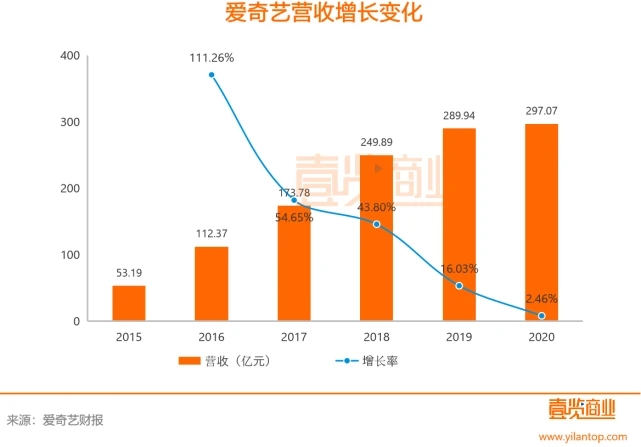 同時,拉長愛奇藝數(shù)據(jù)時間線,《壹覽商業(yè)》發(fā)現(xiàn)自 2015年開始愛奇藝的營收從53.19億元增長到了2020年的297.07億元,但營收增速從2016年的111.16%下降到了2020年的2.46%。而虧損額卻從2015年的25.75億元擴大到了2020年的70.38億元。