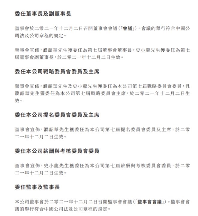 與此同時,濮韶華及史小龍獲委任為聯(lián)華超市第七屆戰(zhàn)略委員會委員,且濮韶華獲委任為第七屆戰(zhàn)略委員會主席;濮韶華獲委任為第七屆提名委員會委員及主席,史小龍獲委任為第七屆薪酬與考核委員會委員;監(jiān)事會宣布,李峰獲委任為第七屆監(jiān)事會監(jiān)事長;以上委任均于2021年12月2日生效。