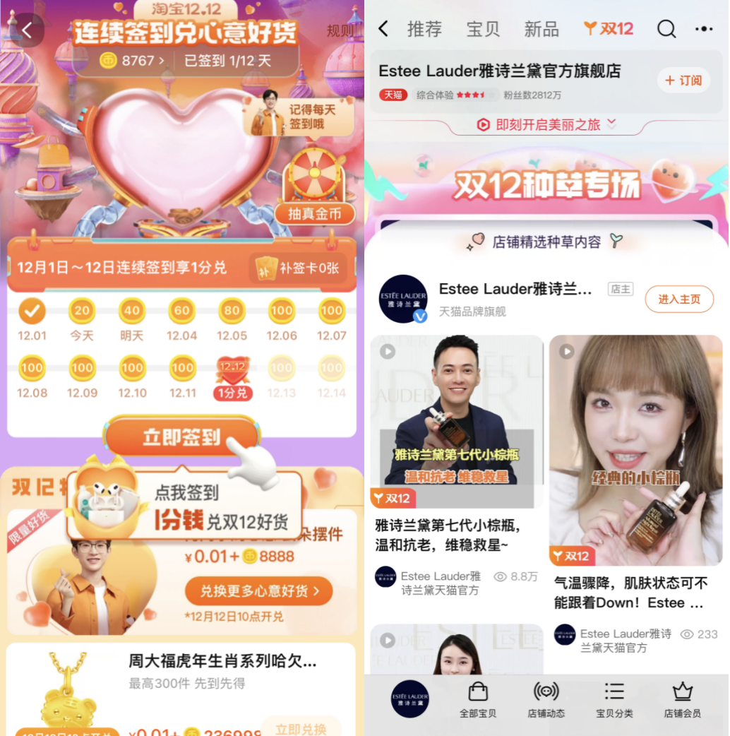 目前雖然活動(dòng)還未開始,但淘寶首頁已經(jīng)有雙12簽到換好禮和雙12必逛新發(fā)現(xiàn)兩個(gè)專區(qū)。雅詩蘭黛、嬌韻詩、薇諾娜等不少品牌在旗艦店也設(shè)置了以官方和各博主的安利視頻為主要內(nèi)容的雙12種草專場。同時(shí)在12月2日,淘寶還上線了新功能“一起逛”,用戶向淘寶好友發(fā)起語音通話邀請后,即可看到好友正在瀏覽的商品。
