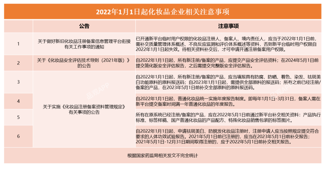 《化妝品注冊(cè)備案管理辦法》《化妝品注冊(cè)備案資料管理規(guī)定》《化妝品新原料注冊(cè)備案資料管理規(guī)定》《化妝品安全評(píng)估技術(shù)導(dǎo)則(2021年版)》等配套法規(guī)已于2021年5月1日開(kāi)始施行,但從2022年1月1日開(kāi)始,企業(yè)還需注意以下6大事項(xiàng):