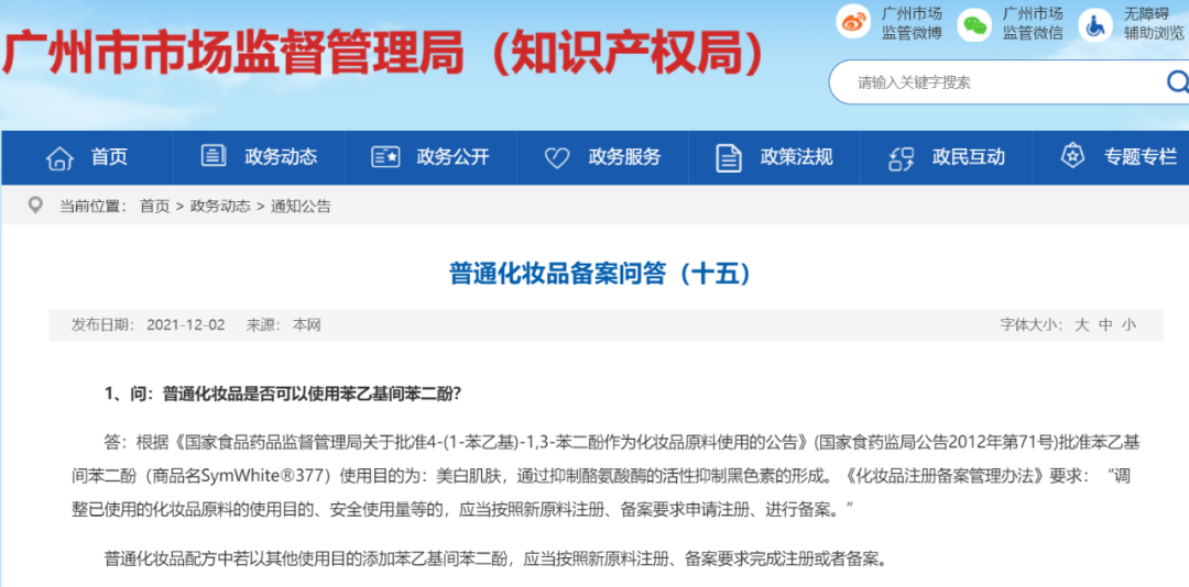 12月2日,廣州市市場(chǎng)監(jiān)督管理局發(fā)布《普通化妝品備案問(wèn)答》,明確指出,“普通化妝品配方中若以其他使用目的添加苯乙基間苯二酚(俗稱“377”),應(yīng)當(dāng)按照新原料注冊(cè)、備案要求完成注冊(cè)或者備案”。
