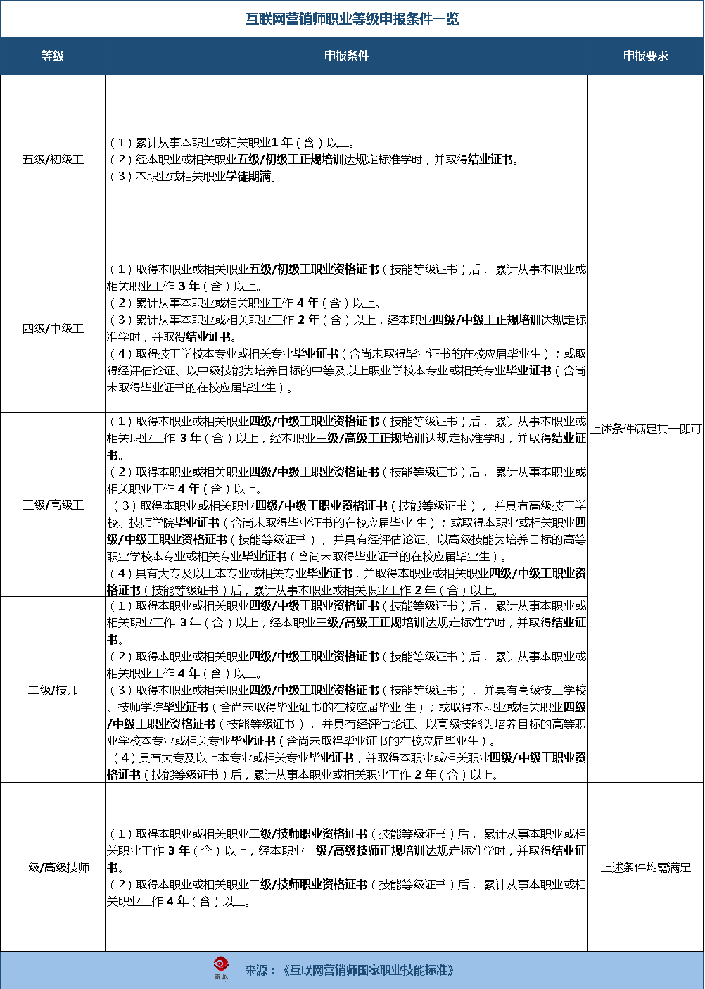 此外,《技能標準》還規(guī)定,互聯網營銷師必須從事本職業(yè)或相關職業(yè)1年及以上,才能申請五級/初級工;取得五級/初級工證書、從事本職業(yè)3年以上,或者累計從事本職業(yè)4年及以上,才能申報四級/中級工。此后再申請“升級”,則需進行培訓。