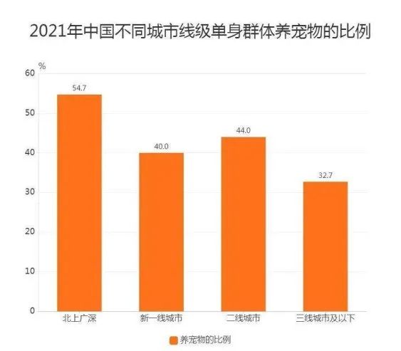 而中國(guó)單身經(jīng)濟(jì)的崛起,也助推了寵物市場(chǎng)的發(fā)展。越來越多的單身人士愿意養(yǎng)寵物來降低生活的孤獨(dú)感,這一現(xiàn)象在一、二線城市尤為普遍。數(shù)據(jù)顯示,2021年,北上廣單身群體養(yǎng)寵物的人數(shù)占比54.7%,居城市排行榜首。其次是二線城市養(yǎng)寵物的單身群體,占比44%。而在所有養(yǎng)寵物的人群里,未婚者占57%。