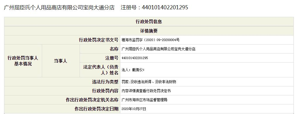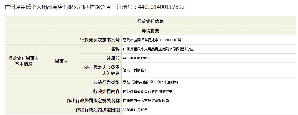 值得一提的是,針對(duì)此事,廣州屈臣氏曾于2021年11月19日向廣州市監(jiān)局遞交不予處罰申請(qǐng),但未被采納。最終,廣州市監(jiān)局對(duì)廣州屈臣氏白云石夏路分店處以2.3萬(wàn)元罰款,責(zé)令其改正“未建立并執(zhí)行進(jìn)貨查驗(yàn)記錄制度”等違法行為,并給予警告。