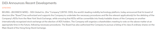 如上圖所示,滴滴在聲明中稱董事會已授權并支持公司采取必要的程序并提交公司的美國存托憑證(ADS)從紐約證券交易所退市的相關申請,同時確保美國存托憑證(ADR)持有人可以在另一國際公認的證券交易所轉換為公司的可自由交易的股票。此外,董事會已授權滴滴尋求其A類普通股在香港聯(lián)交所主板上市。