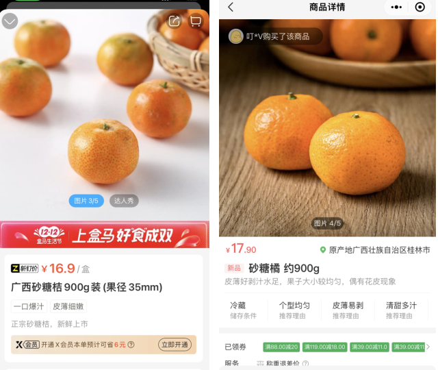 以900g包裝的廣西砂糖桔為例,叮咚買菜售價(jià)為17.9元,盒馬APP上的價(jià)格為16.9元。