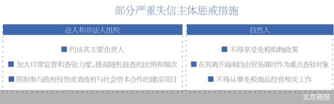此次《規(guī)定》的出臺(tái),在嚴(yán)重失信主體的認(rèn)定標(biāo)準(zhǔn)、懲戒措施方面進(jìn)行了進(jìn)一步明確,同時(shí)建立了嚴(yán)重失信主體的認(rèn)定和懲戒的工作機(jī)制。相較于此前發(fā)布的相關(guān)政策,《規(guī)定》對(duì)于嚴(yán)重失信主體的懲戒更加嚴(yán)格。海南人大官網(wǎng)發(fā)布的《規(guī)定》解讀提出,懲戒的對(duì)象是主觀上有明顯故意、客觀上有嚴(yán)重違法違規(guī)情節(jié)的極少數(shù)嚴(yán)重失信的信用主體,通過(guò)對(duì)這一少數(shù)群體實(shí)施聯(lián)合懲戒,達(dá)到警示震懾的效果,引導(dǎo)經(jīng)營(yíng)主體和消費(fèi)者自覺(jué)遵守免稅購(gòu)物的相關(guān)法律法規(guī)規(guī)定。