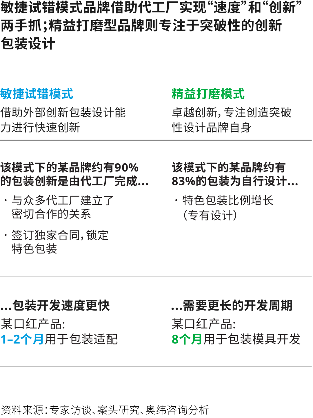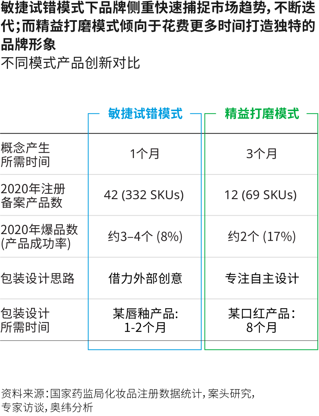 (以兩個(gè)模式的典型品牌為例,奧緯咨詢發(fā)現(xiàn)敏捷試錯(cuò)模式下某品牌在2020年注冊(cè)332款產(chǎn)品,其中42款被推向市場(chǎng),精益打磨模式下某品牌同年注冊(cè)69款產(chǎn)品,其中12款和消費(fèi)者見(jiàn)面。)