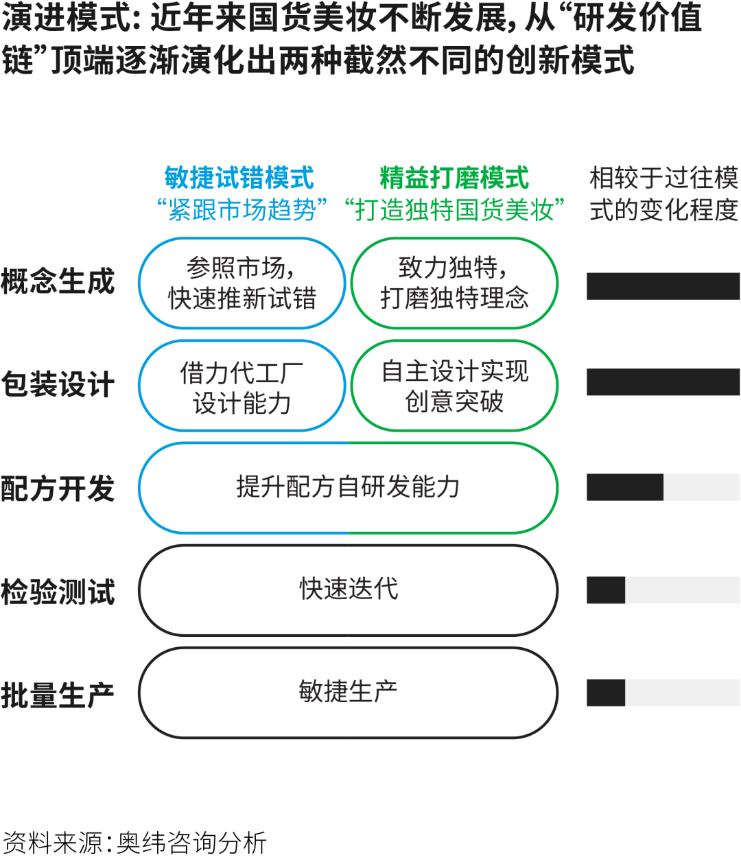 不過(guò)快之下也有模式細(xì)分。奧緯咨詢認(rèn)為國(guó)貨美妝在此前基礎(chǔ)上迭代出兩類。一種緊跟市場(chǎng)潮流的「敏捷試錯(cuò)」模式,大量引用外部合作方加快設(shè)計(jì)、包裝等流程,不斷推出新品來(lái)測(cè)試市場(chǎng)反應(yīng),有可能會(huì)進(jìn)化成平臺(tái)型選手的代表;另一種「精益打磨」模式則試圖為消費(fèi)者打造具備中國(guó)文化符號(hào)的美妝品牌,往往在后期有出海淘金的潛力。