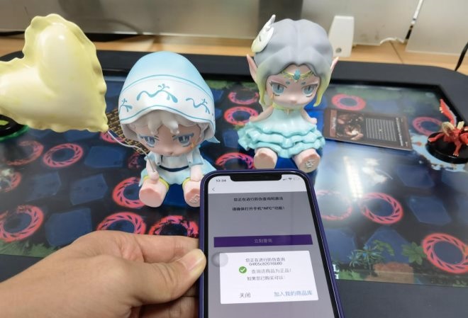 山海潮玩通過在玩具內植入nfc線圈類芯片,實現(xiàn)防偽功能。玩家拿起帶nfc功能的手機,打開山海潮玩app或小程序,靠近玩具,便能識別出真?zhèn)。另外,山海潮玩通過投資方達鐸區(qū)塊鏈中國技術中心,在潮玩中加入區(qū)塊鏈技術。玩家可跳轉到第三方公鏈網站,進行nfc防偽信息查詢。