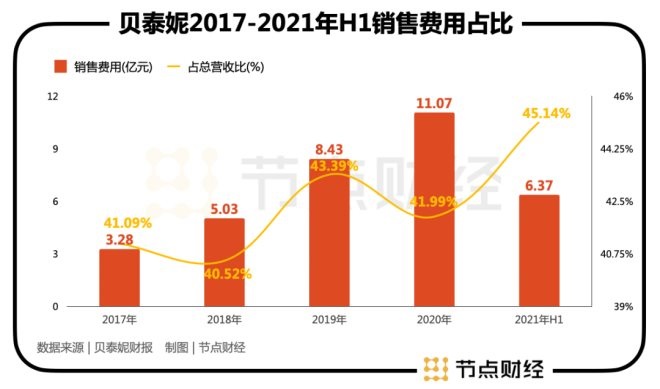 而相比研發(fā)投入,貝泰妮的銷售費用占比卻在逐年走高。2021年前三季度,貝泰妮銷售費用為9.78億元,同比增長46.83%,營收占比約為46%。2017年至2021年上半年,貝泰妮的銷售費用占當期營業(yè)收入比例分別為41.09%、40.52%、43.39%、41.99%和45.14%。