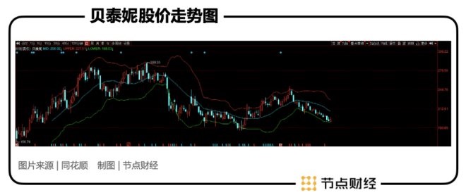 本文開頭已經(jīng)介紹過貝泰妮目前的股價,而從今年3月份登陸創(chuàng)業(yè)板后,貝泰妮的股價在7月份一度達到289.35元/股的高點,但隨后轉(zhuǎn)為下跌,至今回撤幅度超過30%。在此期間,其股價曾一度反彈,但并沒有突破區(qū)間震蕩的范圍。