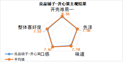 松子是4種堅果種最容易剝殼,良品鋪子臻品紅松雖然色澤方面表現(xiàn)稍微遜色,但在整體喜好度、開殼難易程度以及味道上都要高于其他品牌平均值,尤其是味道指標(biāo)上,測評官認(rèn)為良品鋪子臻品紅松更能保持松子特有香味。