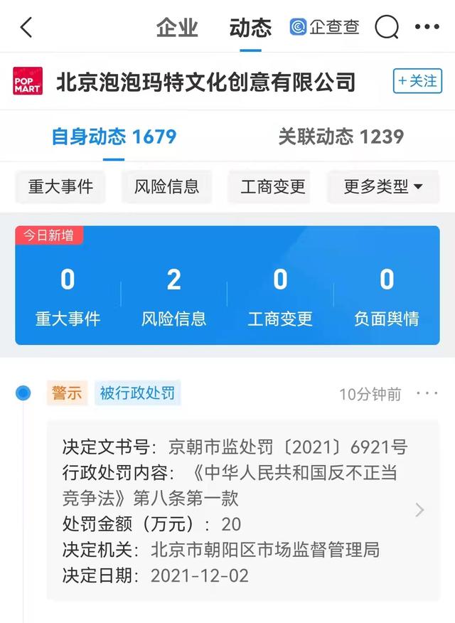 企查查App顯示,近日,北京泡泡瑪特文化創(chuàng)意有限公司新增行政處罰,因違反反不正當(dāng)競(jìng)爭(zhēng)法第八條第一款被罰20萬元。