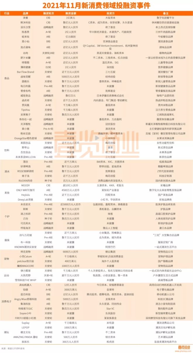備注:融資以品牌或媒體披露時間為主,涉及多個賽道的首選品牌/企業(yè)的主營業(yè)務(wù)。對于向市場公開金額的融資,計(jì)算中用實(shí)際數(shù)字。對于沒有公開的金額融資,部分融資額數(shù)據(jù)為估算值,計(jì)算方法如下:數(shù)十萬=50萬;數(shù)百萬=300萬;數(shù)千萬=3000萬;數(shù)億=30000萬;近億及億元=10000萬;千萬級=1000萬;百萬級=100萬。外幣經(jīng)過換算,未披露融資金額暫不計(jì)入。