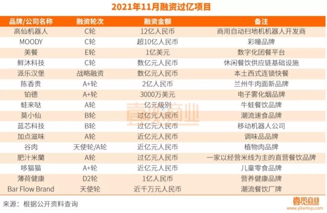 此外,鮮沐科技、派樂漢堡各獲得3億元融資,陳香貴獲得2億元融資,蛙來噠、肥汁米蘭、Bar Flow Brand則分別獲得1億元融資。