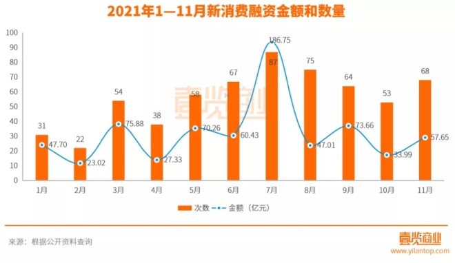 據(jù)《壹覽商業(yè)》不完全統(tǒng)計(jì),11月份新消費(fèi)領(lǐng)域共發(fā)生68起融資事件,融資金額為57.65億元(不包含16起未披露金額融資),比上個月高出近25億元。從整年來看,11月的融資數(shù)量與6月最接近,融資金額也相差不大。