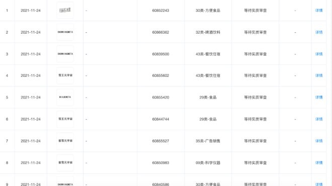 早在11月24日,蜜雪冰城便申請注冊了一系列與元宇宙相關的商標內(nèi)容,包括“蜜雪元宇宙”、“雪王元宇宙”、“MIXUEMEAT”等,國際分類涉及視頻、廣告銷售、餐飲住宿、科學儀器等。