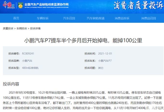 投訴顯示,提車半個月多月后,張先生發(fā)現(xiàn)小鵬P7出現(xiàn)一晚上掉電10~20公里的現(xiàn)象,并且當(dāng)時所宣傳的480公里的續(xù)航,實際上也就跑240公里左右,最多大概跑270公里左右,續(xù)航嚴(yán)重與宣傳不符,令用戶懷疑其品牌質(zhì)量問題與宣傳是否涉嫌欺詐行為。