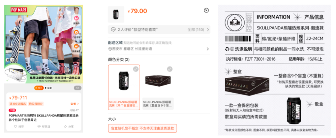 值得注意的是,截至12月7日21點,泡泡瑪特某電商平臺旗艦店中,涉事商品仍未下架。該商品的單個盲盒售價為79元,買家可選擇單獨購買盲盒或整盒購買。在商品詳情頁面的產(chǎn)品信息中,提及“面料:棉/氨綸/聚酯纖維”,但并未提及具體比例。