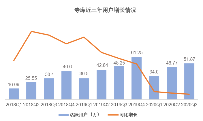 從全年的活躍用戶(hù)情況來(lái)看,寺庫(kù)在2017年的活躍用戶(hù)為22.57萬(wàn),2018年增長(zhǎng)到73萬(wàn),2019年全年活躍用戶(hù)達(dá)到122.3萬(wàn)。隨著2020年進(jìn)入低谷,最新披露的Q3季度,這一數(shù)值已經(jīng)下滑到51.87萬(wàn)。一整年的活躍用戶(hù)僅在百萬(wàn)級(jí)別,平臺(tái)體量始終起不來(lái),增長(zhǎng)還在持續(xù)下降,寺庫(kù)最終也沒(méi)能敵過(guò)垂直電商的“魔咒”。