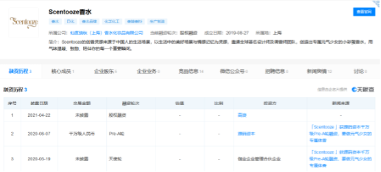 據(jù)天眼查數(shù)據(jù)顯示,2021年1月19日,RE調(diào)香室獲得中信資本領(lǐng)投的戰(zhàn)略融資;2021年4月22日,Scentooze香水獲得高浪融資,這也是Scentooze香水近兩年來獲得的第三筆融資;同年9月14日,氣味圖書館獲得西班牙美妝集團(tuán)PUIG的B輪投資,如今市場估值已超3億元。