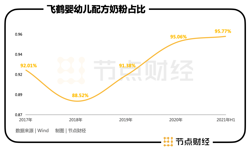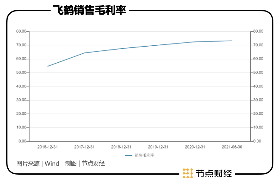 體現在數據上,2021年上半年,飛鶴市占率18.4%,較2019年提升6.6個百分點;2016年-2021年上半年,飛鶴銷售毛利率從54.61%提升至73.26%。說明消費者對飛鶴品牌的信任度和支付溢價的意愿在加強。